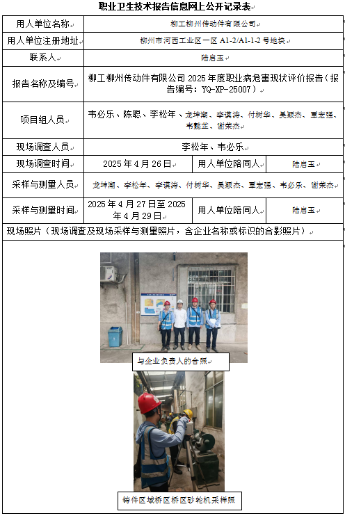 柳工柳州傳動件有限公司2025年度職業病危害現狀評價報告